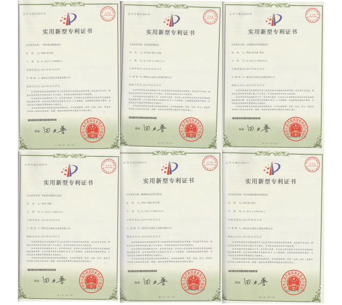 2013年2月,湖北儀天成電力設(shè)備有限公司自主研發(fā)的直流電阻測(cè)試儀、互感器綜合特性測(cè)試儀、電纜故障測(cè)試儀、智能型電纜耐壓系統(tǒng)、斷路器動(dòng)特性分析儀、氧化鋅避雷器特性分析儀共6種產(chǎn)品再榮獲國(guó)家知識(shí)產(chǎn)權(quán)局頒發(fā)的實(shí)用新型專利證書。