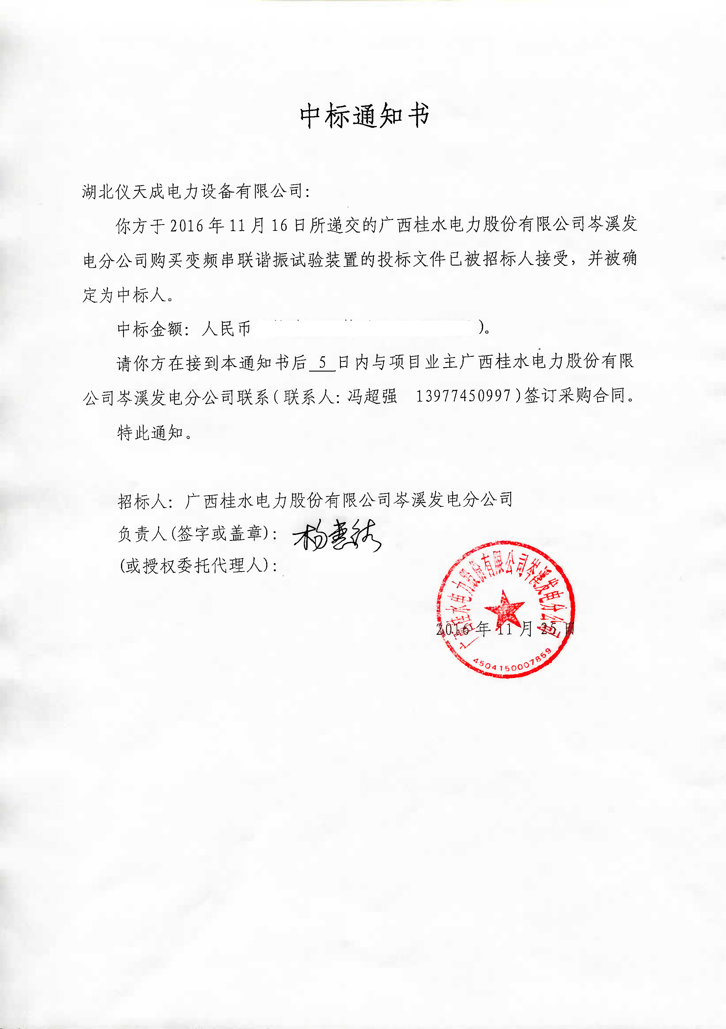 2016年12月,距離2016年結(jié)束不到30天的時間,湖北儀天成銷售部傳來好消息:我公司在廣西桂水電力股份有限公司岑溪發(fā)電分公司的設(shè)備采購招標(biāo)中,從眾多供應(yīng)商中脫穎而出,再次中標(biāo)!