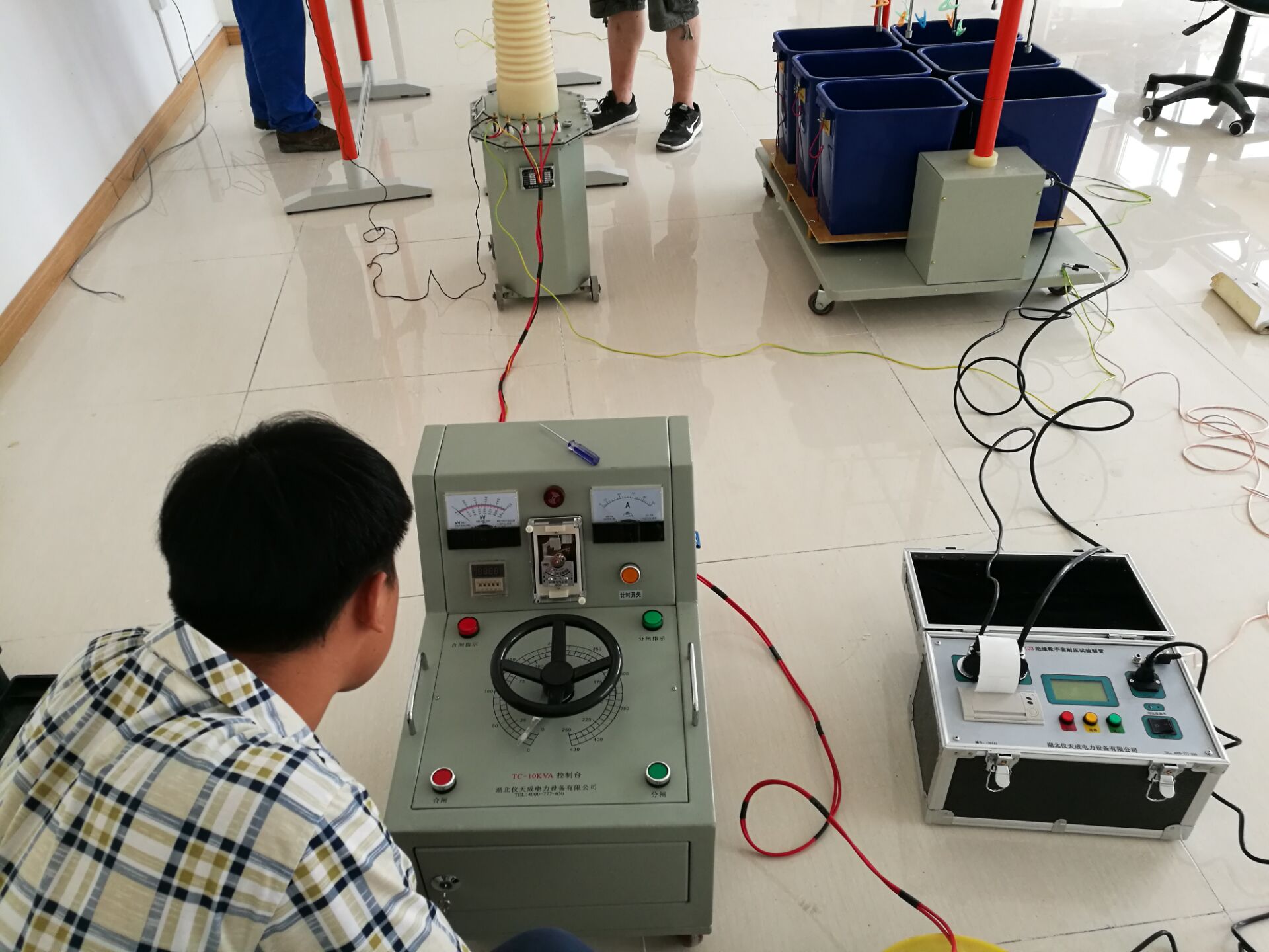 此次培訓的設備和內(nèi)容很多,其中培訓的主要設備是YTC1103 絕緣靴(手套)耐壓試驗裝置。李工首先對設備的原理和功能進行了全面而細致的講解。我公司的該設備比較先進,測試速度快,提高了工作效率;耐壓、高壓泄漏電流直讀,還可自動識別不合格試品,智能化程度高;可同時測試4雙絕緣靴(手套),并可讀取每只的泄漏電流,準確判斷不合格的絕緣靴(手套);底部裝配腳輪,可隨意移動。非常方便。