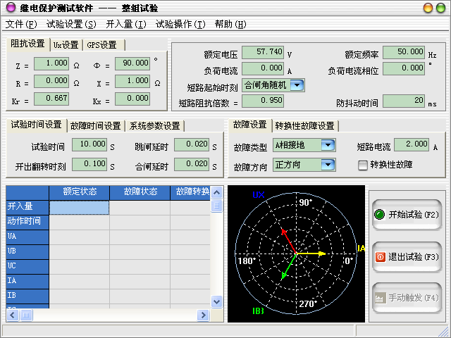 合閘延時(shí):模擬斷路器的合閘動(dòng)作時(shí)間,測(cè)試儀根據(jù)開(kāi)入量的連接,一旦接受到保護(hù)的合閘信號(hào),經(jīng)過(guò)“合閘延時(shí)”后,方進(jìn)入合閘后的電壓電流狀態(tài)。