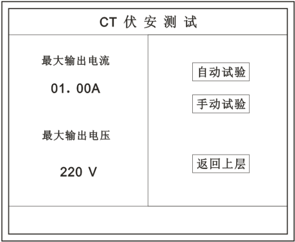 在主菜單界面,旋轉(zhuǎn)鼠標(biāo)將光標(biāo)移動(dòng)到 CT測(cè)試 選項(xiàng)上,按下旋轉(zhuǎn)鼠標(biāo)選擇 CT伏安 即可進(jìn)入伏安特性試驗(yàn)設(shè)置界面(如右圖)。光標(biāo)移動(dòng)至 返回上層 ,按下鼠標(biāo)即可返回主菜單。