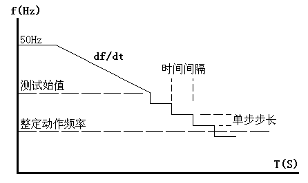動(dòng)作頻率的測(cè)試方法:測(cè)試時(shí)頻率分兩階段變化:開始以50Hz輸出,經(jīng)過變化前延時(shí)后,先按所設(shè)定的df/dt均勻下滑(或上滑)至測(cè)試始值頻率,然后按設(shè)定的步長(zhǎng)以一定時(shí)間間隔逐格降低(或上升)頻率,在該過程中如保護(hù)動(dòng)作,則測(cè)出動(dòng)作值。如未動(dòng)作,當(dāng)變化至測(cè)試終值,即認(rèn)為保護(hù)不會(huì)動(dòng)作而結(jié)束該項(xiàng)目測(cè)試。