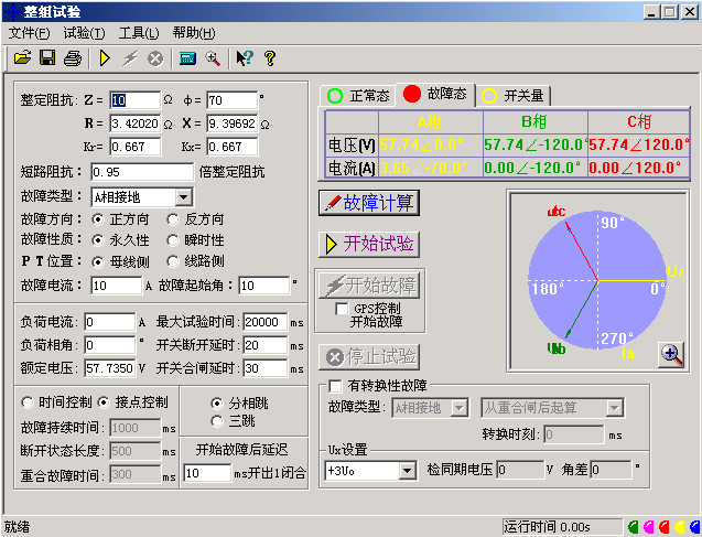 微機(jī)繼電保護(hù)測(cè)試儀整組試驗(yàn)相當(dāng)于繼電保護(hù)裝置的靜模試驗(yàn),通過設(shè)置各試驗(yàn)參數(shù),模擬各種瞬時(shí)、永久性的單相接地、相間短路或轉(zhuǎn)換性故障,以達(dá)到對(duì)距離、零序保護(hù)裝置以及重合閘的動(dòng)作進(jìn)行整組試驗(yàn)或定值校驗(yàn)。下面以“整組試驗(yàn)Ⅰ”為例,簡(jiǎn)要說明其使用方法。軟件界面如圖。