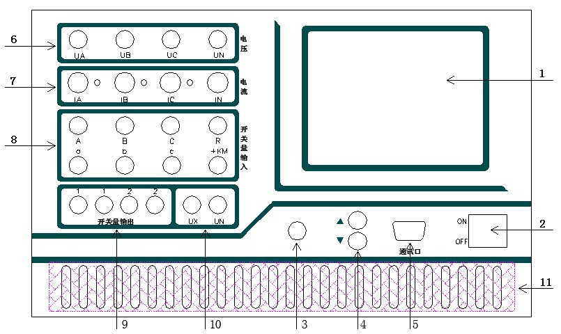 7.IA、IB、IC、IN 為電流輸出端子,各電流端子(IA、IB、IC)右側(cè)的小信號(hào)燈指示該路電流輸出是否存在波形畸變或負(fù)載開路