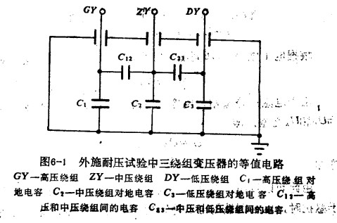 變壓器一般由兩個(gè)以上的繞組組成,每個(gè)繞組對地都有絕緣,相鄰的兩個(gè)繞組也有絕緣,這樣就可以將每個(gè)繞組看成是電容器的一個(gè)極板,接地部分看成電容器的另一個(gè)極板。一臺三繞組變壓器的等值電路,如圖6-1所示。