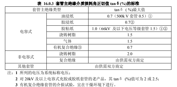 1)套管主絕緣的介質(zhì)損耗角正切值超過表 16.0.3 中的規(guī)定值;