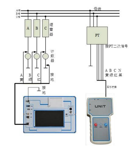 測試線接線方法如圖 3 所示,請先接主機(jī)電流線(航插 4 芯引出 4 根線),接入主機(jī)航插,再接黑線到計(jì)數(shù)器下端地線,然后分別按黃綠紅顏色線接入 A、B 、C 相避雷器下端計(jì)數(shù)器上端。再接單元的電壓線(航插 5 芯引出 4 根線),接入單元航插,再接 PT 二次測量端,分別按黃綠紅黑顏色線接入二次側(cè)測量端的 A、B、C、O,一定要小心謹(jǐn)慎接線以避免 PT 二次或試驗(yàn)電壓短路。