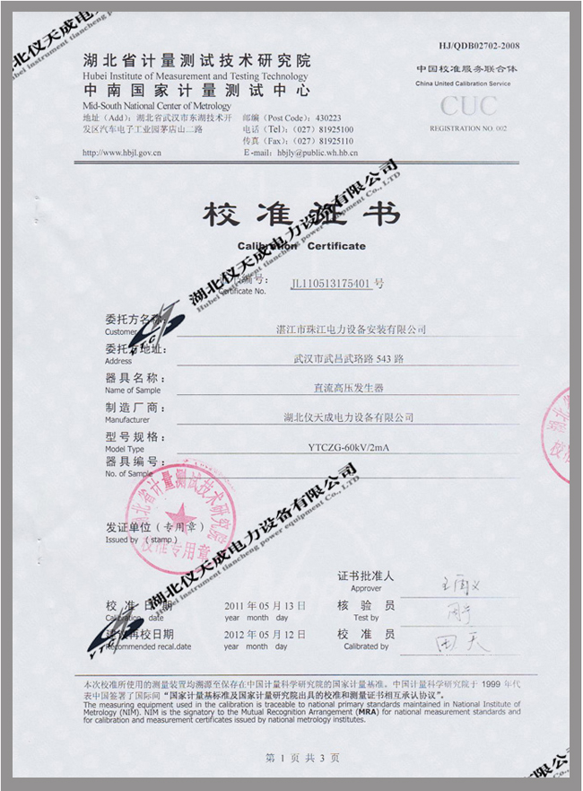 轉(zhuǎn)載:"YTCZG-60kV/2mA直流高壓發(fā)生器鑒定證書" 請注明來源于儀天成電力。 更多技術(shù)問題請致電儀天成電力客戶服務(wù):027-87876585,技術(shù)部專線:027-87876585,在線客服: