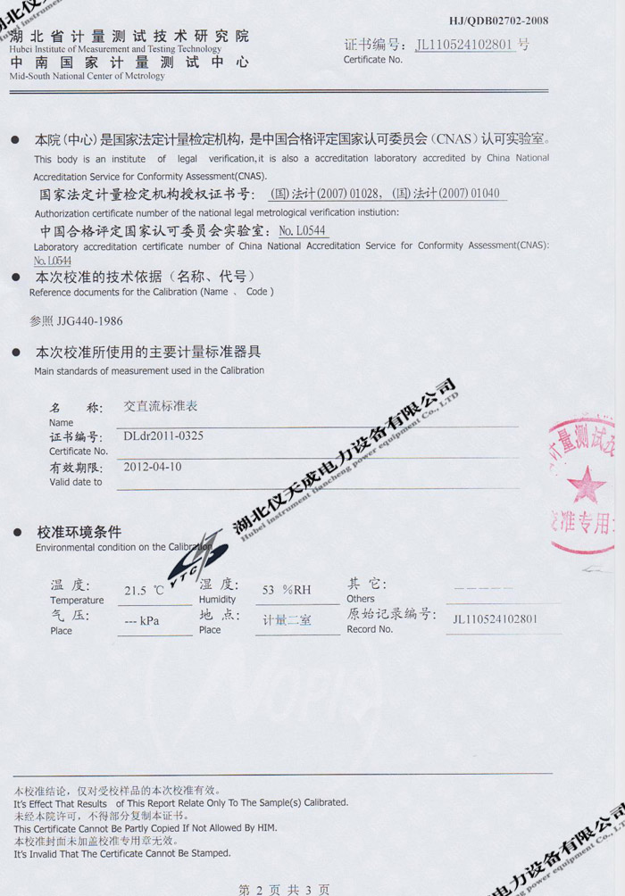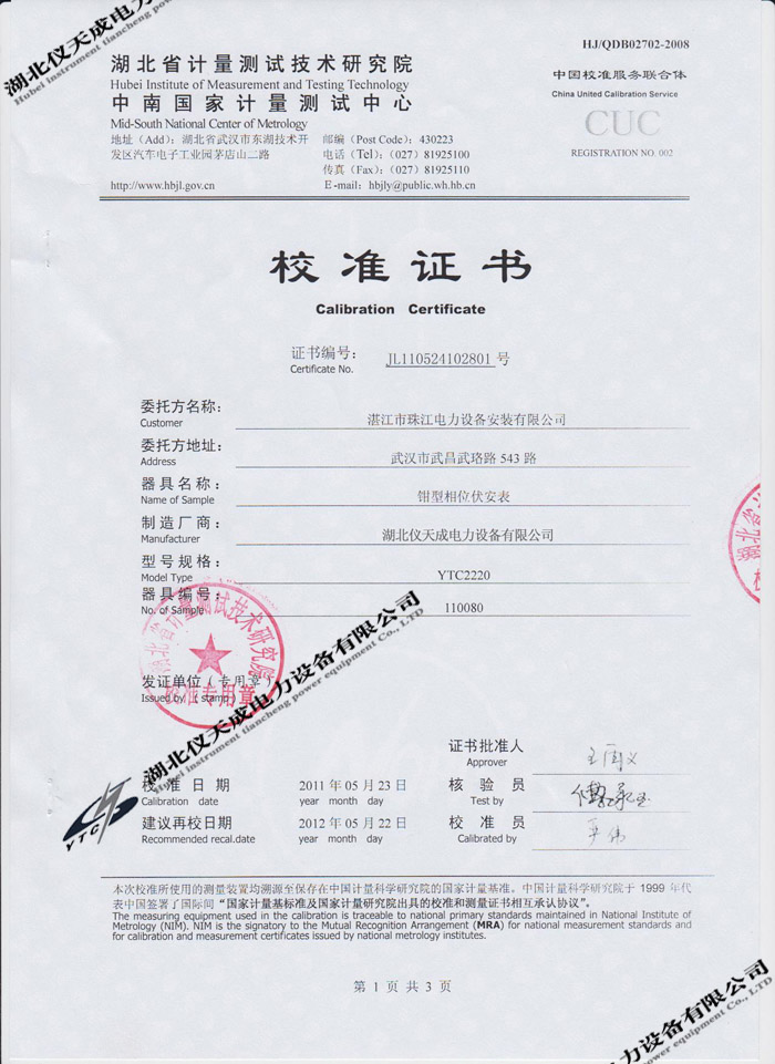 轉載:"YTC2220數(shù)字雙鉗相位伏安表的資質證書" 請注明來源于儀天成電力。 更多技術問題請致電儀天成電力客戶服務:027-87876585,技術部專線:027-87876585,在線客服:719388481