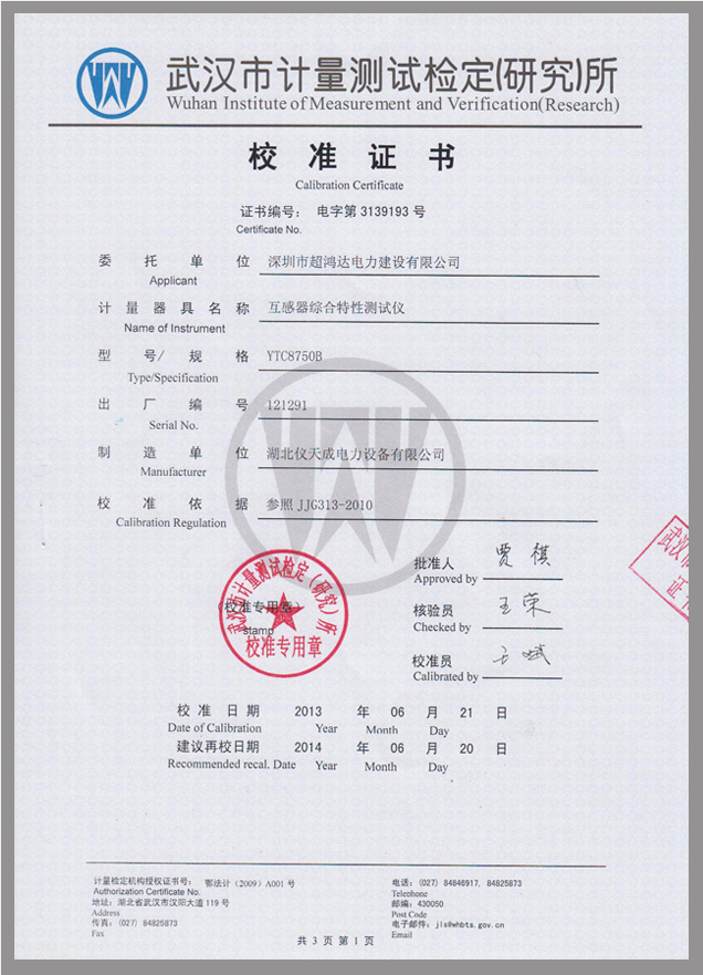 YTC8750B互感器伏安變比極性綜合測試儀鑒定證書